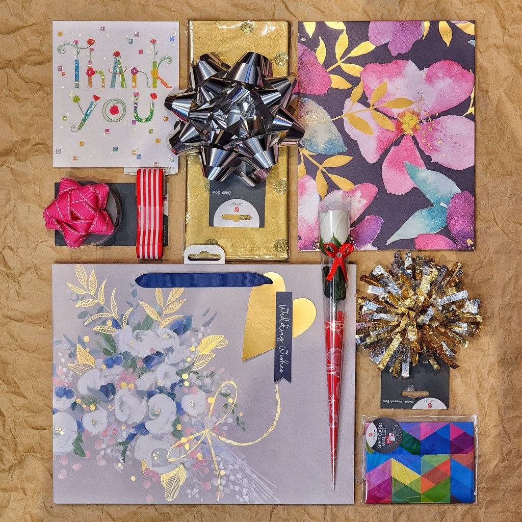 Different Sizes of Gift Bags, Bottle Bags, Wrapping Paper, Different Sizes and Designs of Gift Bows, Ribbons, Thank you Cards…….